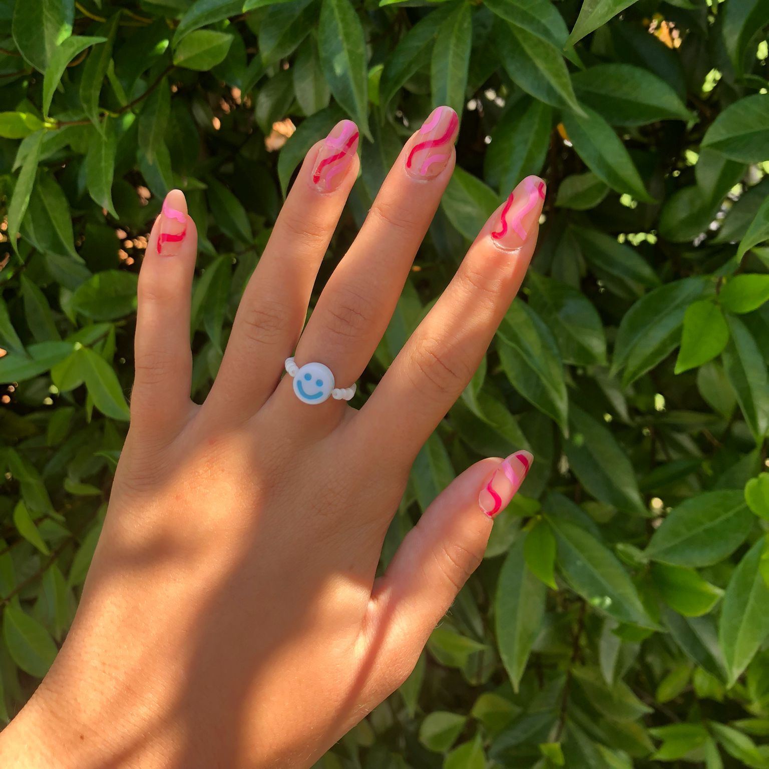 Cuentas blancas y abalorio de carita feliz de diferentes colores: azul, rosa, rojo y naranja.